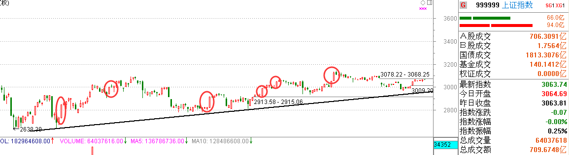 10:58:47 今年指数果然每次出现大阳就走尿性的走势,真是尿性十足,不过指数大周期处于震荡趋势,什么磨人的走势都有可能出现,所以我们心态上要转正过了,不能以牛市的思维对待,而要用震荡的思维去对待。