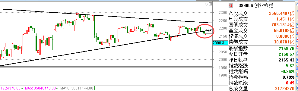 那么,指数缩量收长下影阳k线是否宣告反弹正式开始?单从技术形态上看的话,今天不管是上证指数还是创业板指数都收了下影阳k线,从这形态上看有点早晨之星的味道。从创业板指数上看前面已经四连阴了,今天收了个假阳十字星指数只要不是在单边市场里,那么短期阴线走多了就很容易走出反弹的走势。而且,创业板指数从短期幅度上看,短期的走势有点小超跌走个技术反弹是有的。最后,创业板三角形形态上看,上周五跌破下轨道支撑,今天收阳十字星应该会反弹下到下轨道附近去确认破位,如果后面能收回下轨当然是好事,后面根据形势再去看我们不做预测,如果创业板指数短期真是有效跌破下轨道的话从指数大周期看也不会走出连续下跌的走势大家不要盲目恐慌就行。