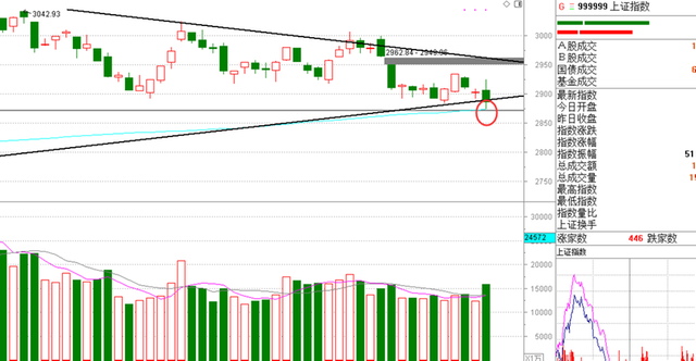 指数周五走出放量下跌的走势,不过分时图还是纠结了点,下探到年线和下方缺口附近后没有继续杀跌下,所以这周要继续留意2870附近的抵抗如何,还是之前反复说的,如果抵抗比较弱直接跌破的话说明指数短期杀跌动能比较强,如果有比较强的抵抗,说不定还会向上冲击一下上轨,至于现在指数向下变盘概率多大,不好说,从短期趋势来说有点偏向空头,但是目前还在支撑位上还没有完全跌破,如果完全跌破就向下变盘了。