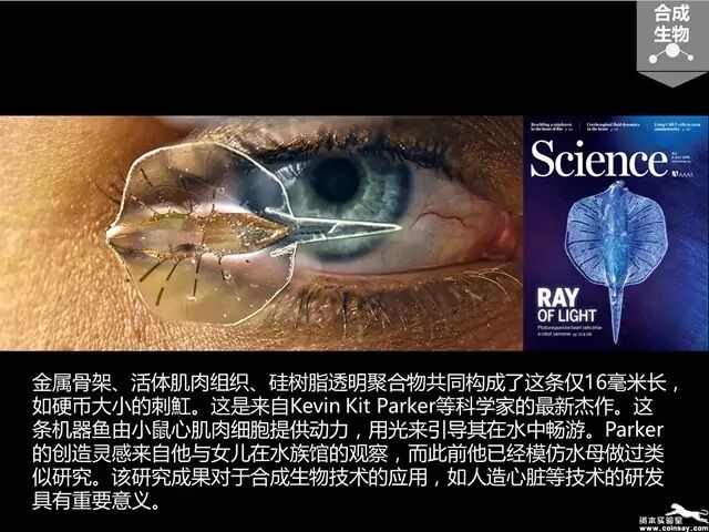 【导读】近期,来自哈佛大学的Kevin Kit Parker与同事的研究成果作为封面论文在《科学》上发表。该文介绍了他们制造的刺魟机器人。这条只有硬币大小的合成生物由小鼠心肌肉细胞提供动力,用光来引导其在水中畅游。据分析,该研究成果对于合成生物技术的应用,如人造心脏等技术的研发具有重要意义。为此,我们可以说,这是一条渺小而奇妙的鱼。