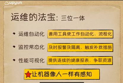 在运维、监控、性能三个方面,有三大法宝:运维自动化、监控常态化、性能可视化。