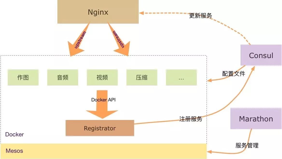 最下面是Mesos,Mesos上面跑的是容器,服务都是以容器提供的,有做图的,音频的,各种各样的服务,有一些是特殊的服务,比如可以用Registrator做注册服务,上报到Consul,前面的Nginx主要是做负载均衡,通过upstream把请求代理到下面。在Consul中的服务地址改了以后,怎样快速反馈给Nginx呢?其实如果把这个解决了,这个图就可以非常好地运转起来。