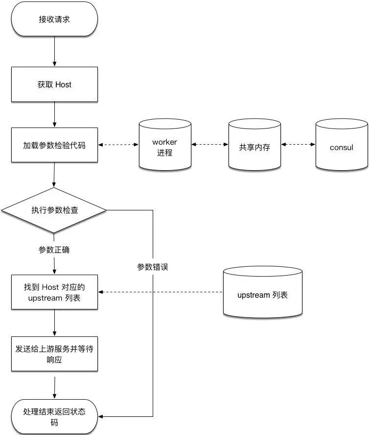 从一开始接收请求到把HTTP里面的host解析出来,解析出来以后这里涉及到动态lua代码加载,当host解释出来以后,我们到upstream列表里面查后端有没有提供服务,如果有的话会进行转发。