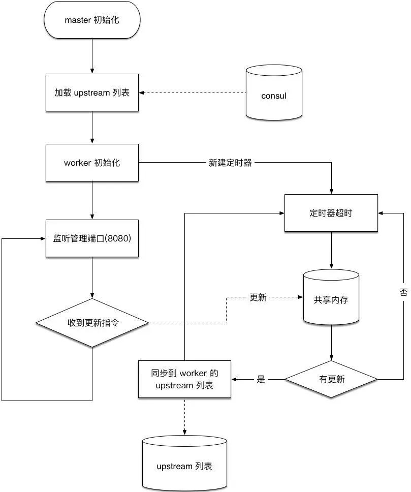 下图是一个upstream管理的流程图,最开始的时候,从Consul加载,一个是接收端口更新指令的,然后另外一个到定时器,这个定时器不断超时查看共享内存,,如果发现共享内存里的版本与当前进程不一致,就更新到进程内部。