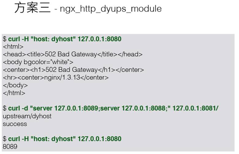 上图例子中,请求了8080端口,发现502了,因为这个时候,我们在host下面没有任何上游服务存在,最后给127的8081端口发送请求,要在Nginx动态加上两个server地址,他们对应的host就是dyhost,第三个指令和第一个指令是完全一样的,但是结果不一样,它返回了正确的输出,并没有返回502,说明这第二个指令中的两个地址已经生效了,这个已经完全达到了我们的目的,通过一个HTTP请求,改变Nginx的upstram。