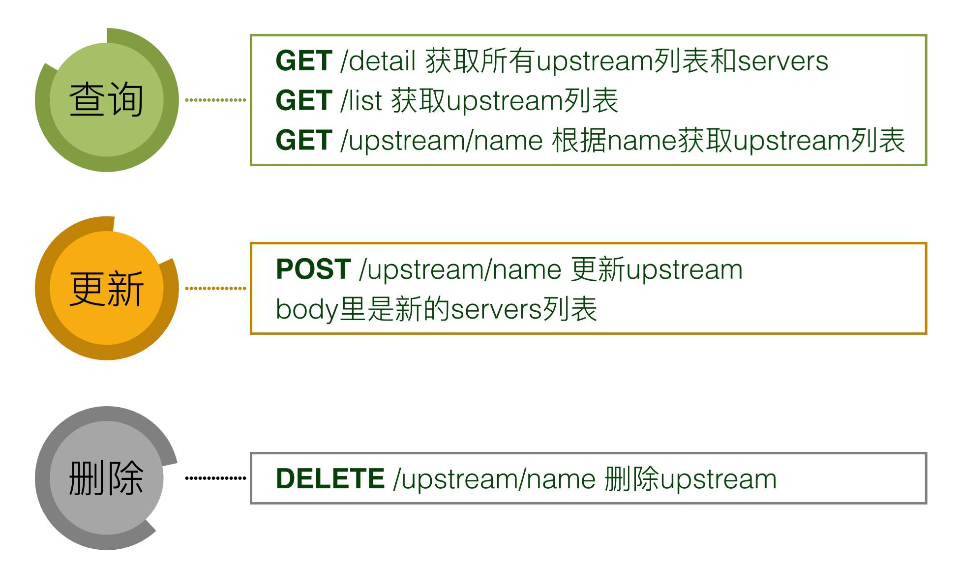以上两个方案都不行,那我们想要什么方案?我们想让Nginx监听一个管理端口,可以通过对管理端口发指令,让它自己更新Upstream,有没有这样的方案呢,其实是有的,下面是一个开源的Nginx C模块,它做的事情就是通过 HTTP 指令更新、操作、删除upstream,如下图: