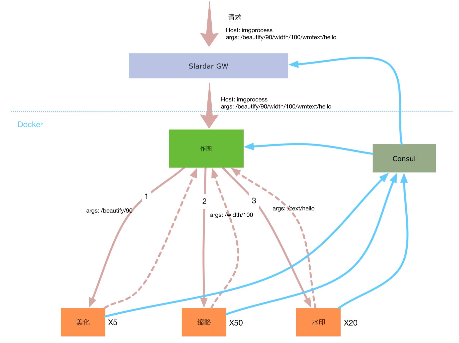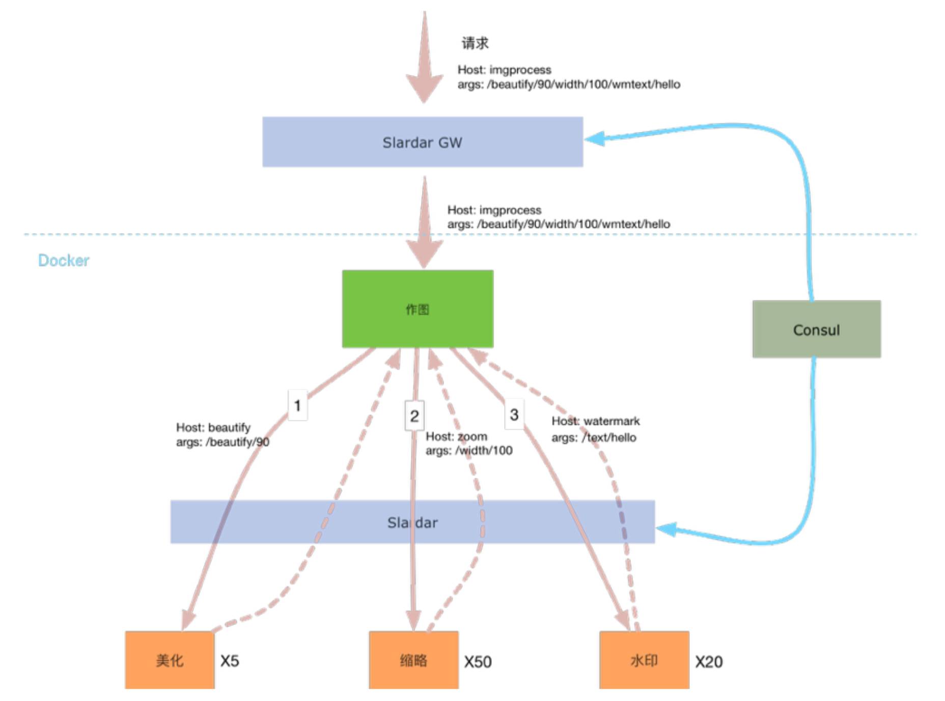 上图是作图服务拆分的示意图,如果我们不进行微服务改造的话就只有中间这个作图服务,它做了所有的工作、所有的缩略图操作。改造之后,这个大的作图,会被分解成一些小的作图模块,这些小的模块,各自提供服务,当然都是以容器的形式,比如做缩略图需要硬件加速,就可以把它抽出来了,可以做很多实例,水印的可能还是按原来老路子走,就是CPU做,也不需要太多实例,切开以后,发现中间大的服务,虽然是不需要任何功能的,因为它只要做调度,但是它需要从Consul里面拿到所有微服务的地址,并且还要去做一些负载均衡,因为地址有好多个,还有做容错,还得去做定时的更新,因为这个服务的地址,可能是会更新的,更新了以后要重新拉内部的地址,这样显得中间这个做图服务就会做了很多不该属于它做的工作。为了解决这样的问题,我们在中间又加了一层slardar。