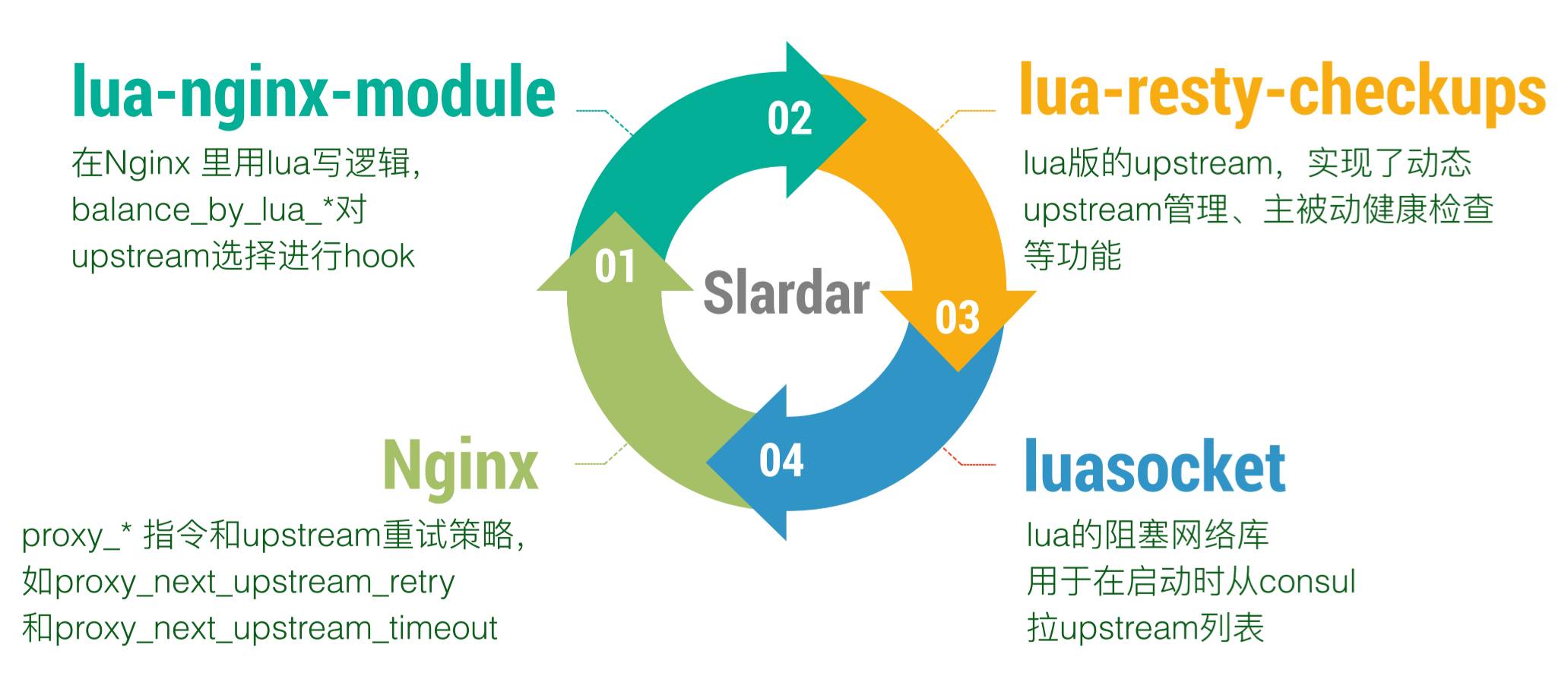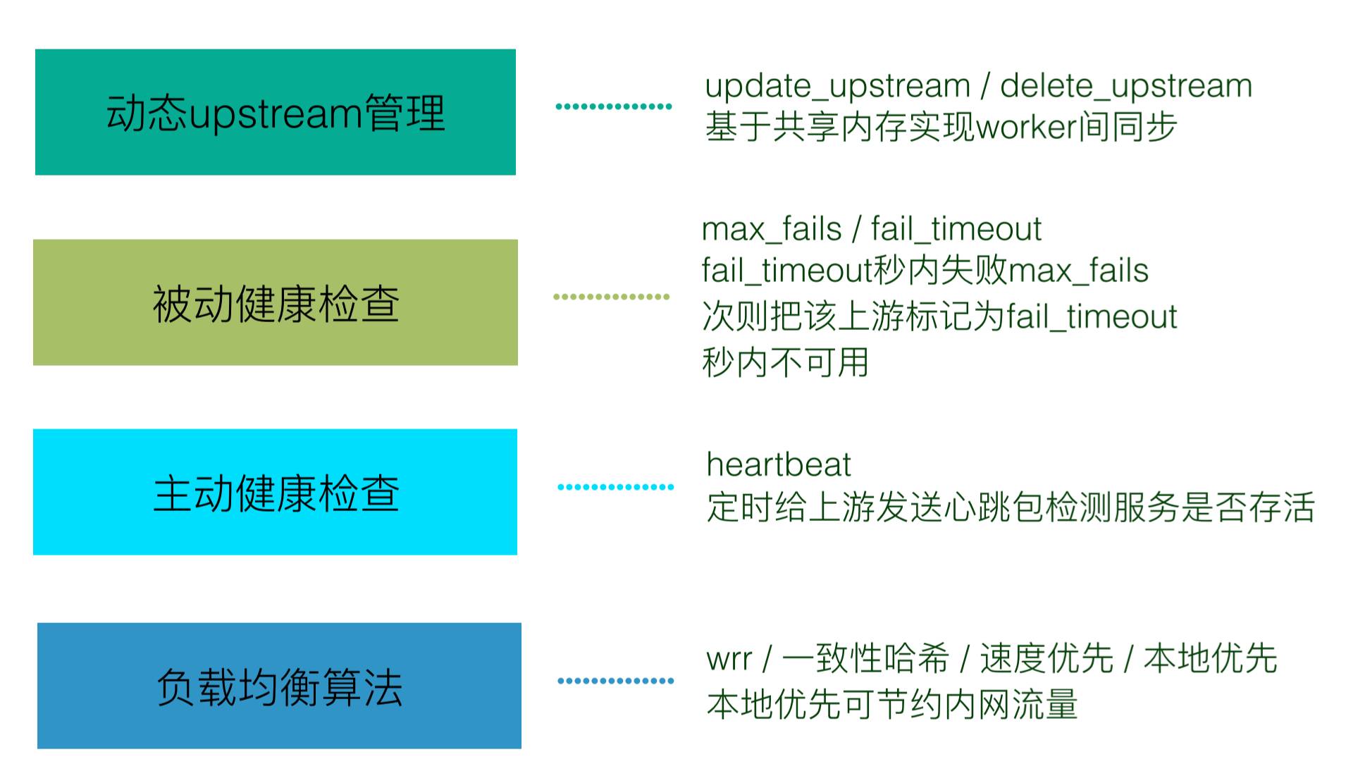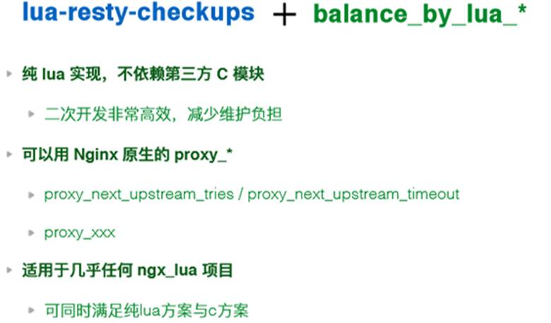 第三个部分是lua resty checkups,它是把Nginx upstream模块常用的功能单独抽出来,用lua重新实现了一遍;