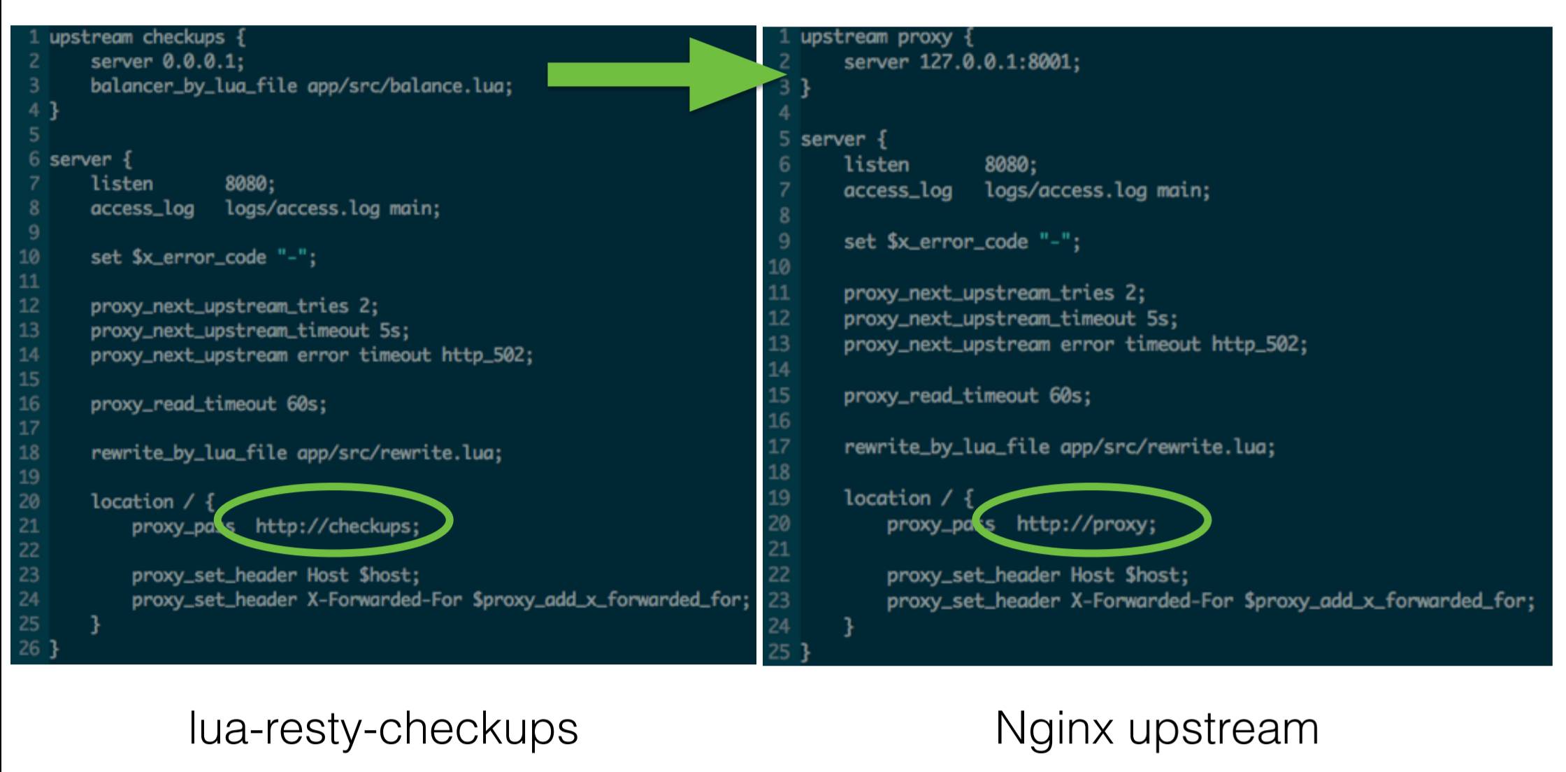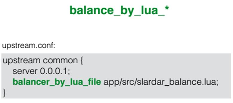 这个指令,它的作用就是作用在upstream选择这步的,比如我们写在upstream里面,就不会再进原来C模块的代码,而会到我们指令后面的lua代码里面来,这样可以在lua代码里面控制这些upstream的选择,因为我们有lua版的checkups,所以这些操作可以很好的结合起来。