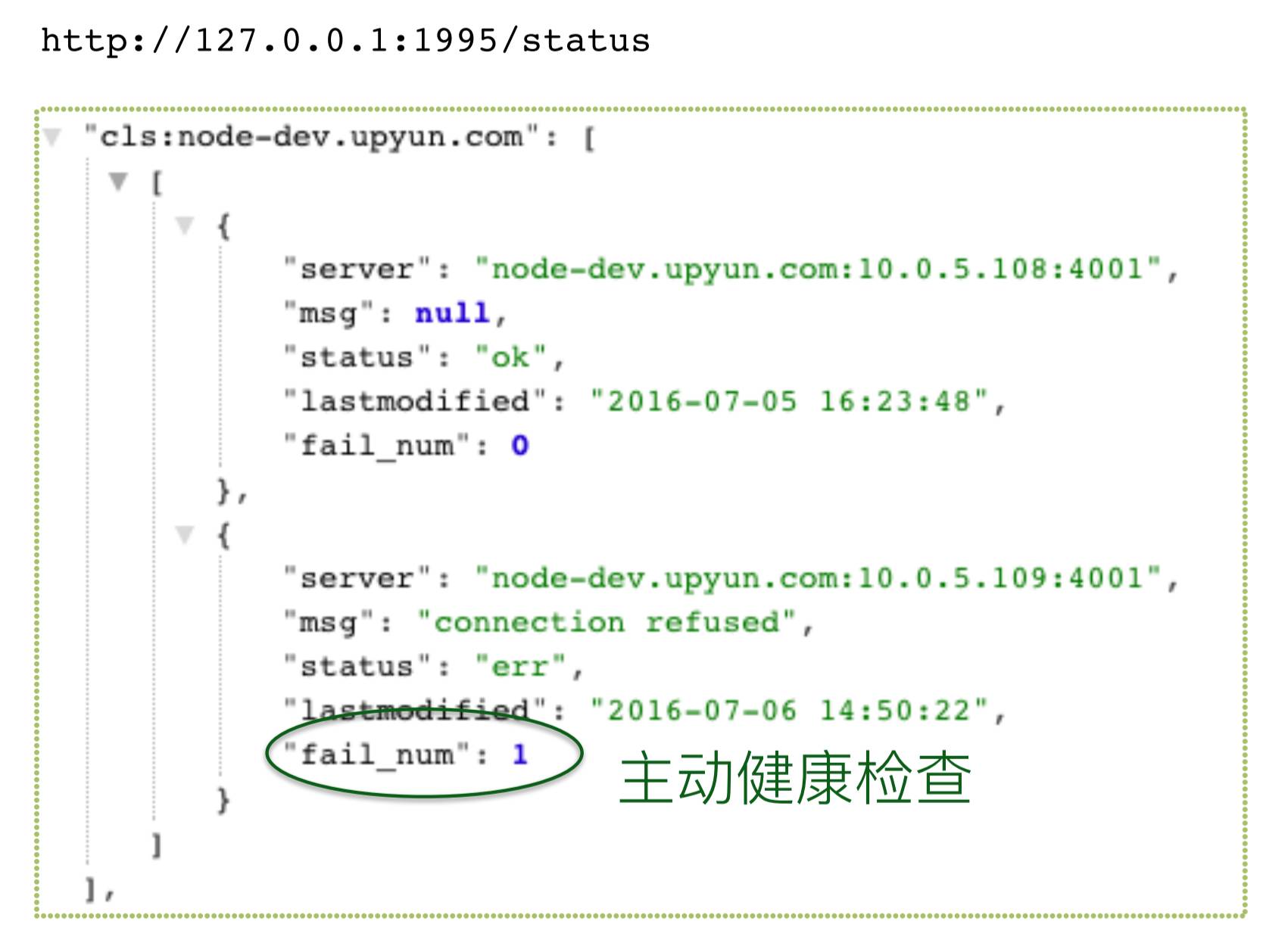 在上图的状态里可以看到椭圆中那两个我们刚刚加进去的服务,因为有主动健康检查,如果加的是有问题的服务地址,会显示一个错误,比如我们第二个加进去的就是不存在的地址,然后这个服务就不会被Nginx选为可用的上游。