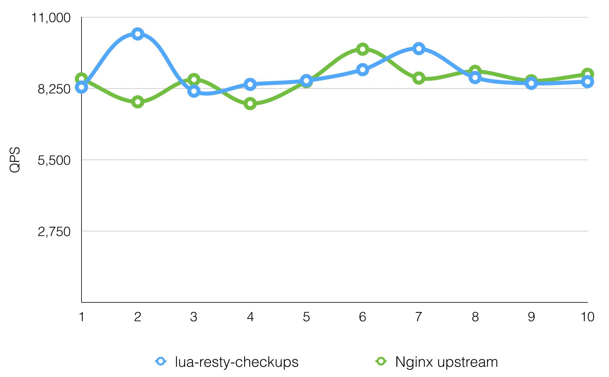 上图的对比有一个地方不一样,就是圈出来的地方,左边是用lua做upstream选择的,相应的upstream配置会有一些变化,右边是原生Nginx的配置。对这样的配置进行压测,压测的结果在QPS峰值上没有明显差距,所以用lua版方案和C方案在性能上的损耗其实可以忽略的,可以放心用它。