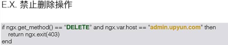 中间是lua的代码,它的意思是说我想要把host为admin.upyun.com的DELETE操作全部禁用,除此之外,任何你想象出来的操作都可以用lua代码实现,它的功能是非常强大的。我们lua代码也有状态页,当我们加入了lua代码,可以看到当前跑的lua代码的版本以及加载时间等信息。