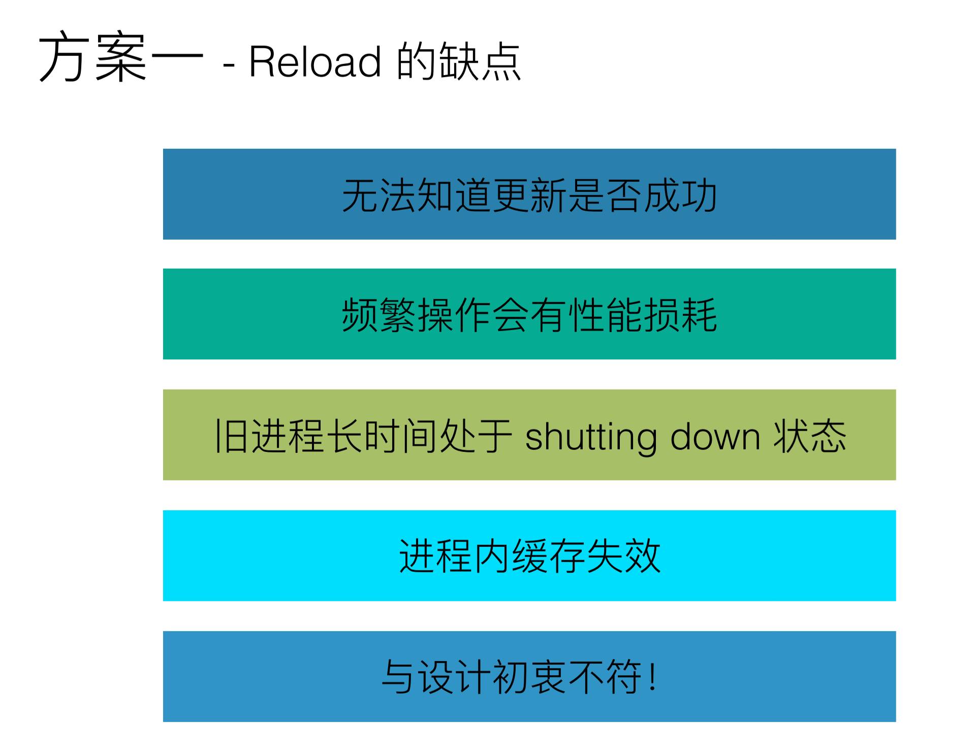 上图的框里面是一个配置的模块,中间两个括号括起来的都是一些需要被实例化的变量,当服务发生改变的时候,会生成真实的配置文件,然后用生成的真实的配置文件进行reload操作,Reload是一个平滑的过程,不会对当前的请求造成任何影响,所以可以达到更新Consul,并且把Consul的信息反馈给Nginx的目的,但是我们没有采用这个方案,主要是因为下面几个问题: