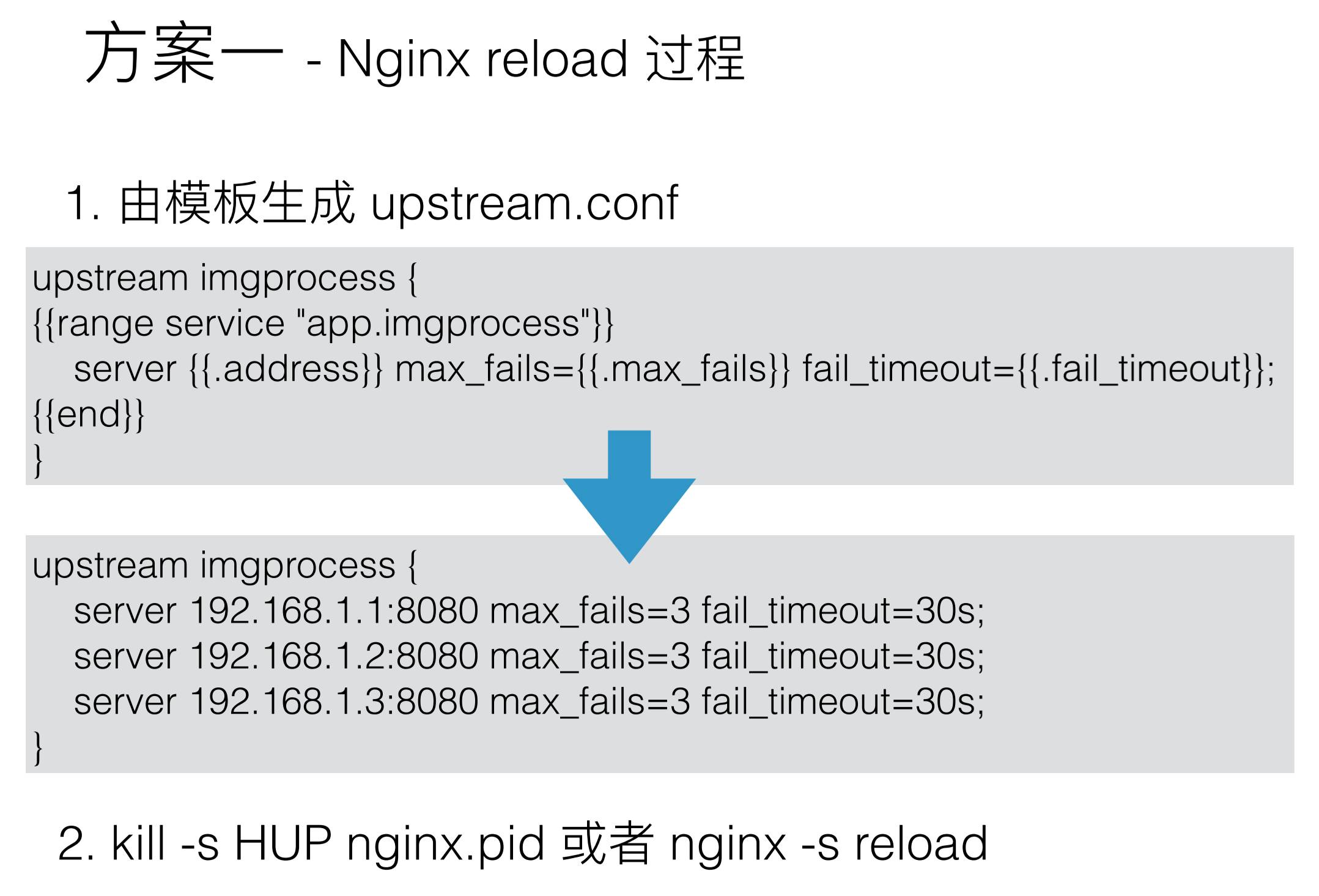 第一种解决方案是用Consul template,监听Consul中服务变动,当配置变动时,由模块重新生成配置,最后对Nginx进行Reload操作,让它生效。这里有一个例子,如图: