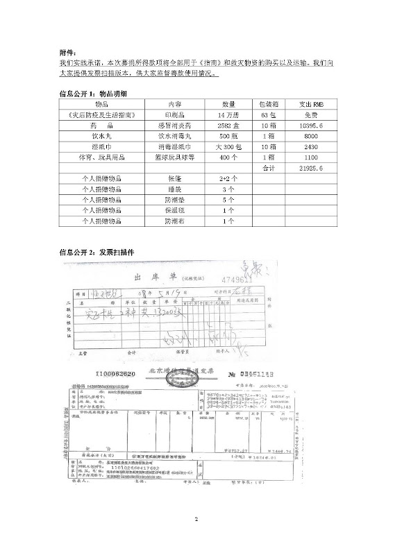 NGO北京联盟共募得善款¥34868.2,成都六万与北京十四万份指南获免费印刷,捐款购买了一万余元的药品,八千元的净水药片,2430元三百包消毒用湿纸巾,1100元皮球等玩具。善款剩余部分¥12942.6将用于购买第二批物品包括净水片、药品、消毒巾等灾区紧缺物资,继续发往成都。全部救灾物资到达成都后,将连同NGO 四川地区救灾联合办公室募得的来自全国各地的其他捐助物资,通过已经联系到的红十字会的发放渠道,尽快送到灾民手中。