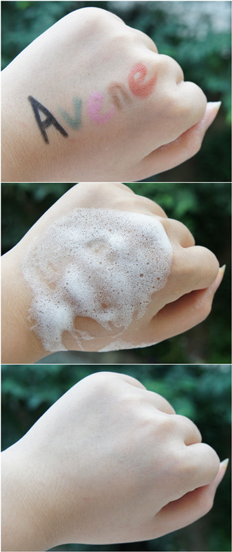 清洁能力小测试,用眼线笔、眼影、口红以及眉笔在手背上画了个Avene字样,然后用洁肤凝胶来做清洁。加水揉搓出泡泡来,轻轻按摩手背肌肤,然后用清水冲洗干净。看,手上所有的繁华都落净了~