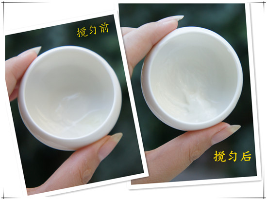 不到1分钟的时间,精油便与玫瑰水混为一体,变成乳霜状,咱再用小勺子轻轻地搅匀调好,控油祛痘乳液就诞生了,看上去是不是水当当的呢~