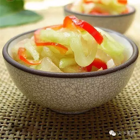 做法:西瓜皮去掉红色西瓜红瓤部分,削去表面绿色的硬皮,切成小块,加入适量的盐、醋、白糖和香油,搅拌均匀即可。