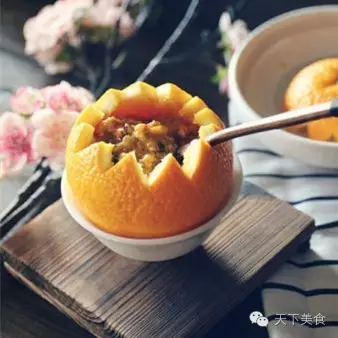 1、把橙子顶部四分之一处切下,留用毋弃,挖掉内瓤,保留一些橙汁;