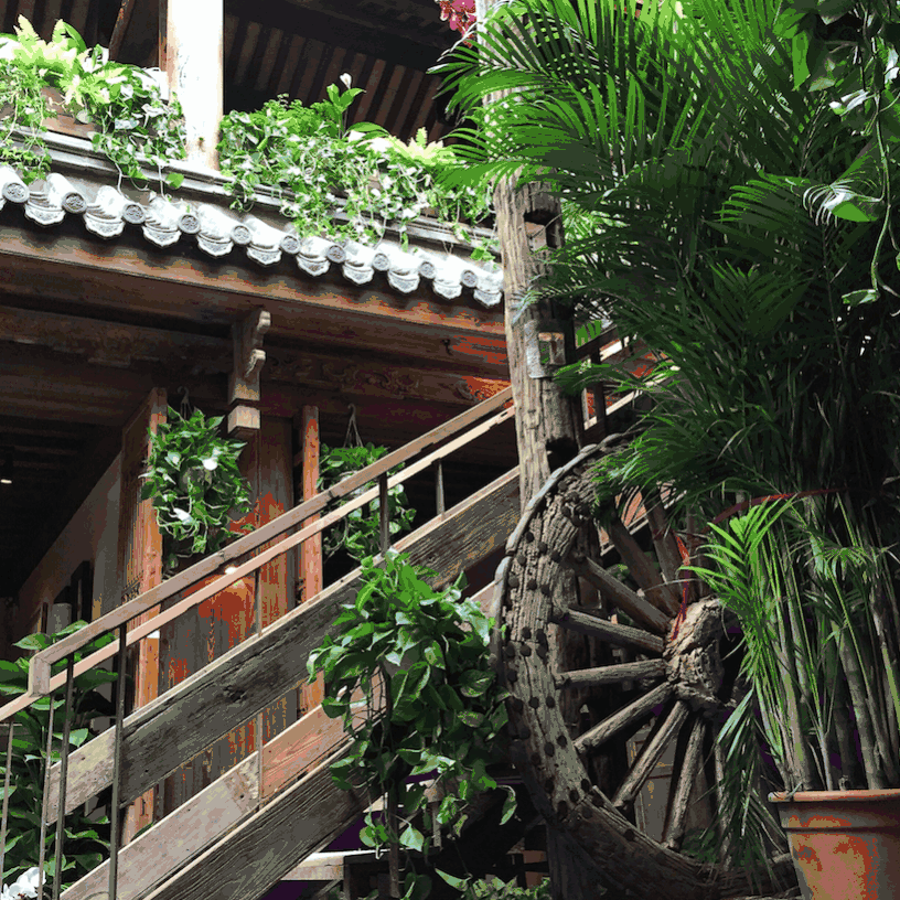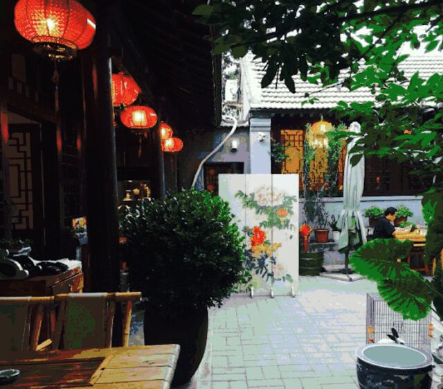 兜兜转转,终于找到了东单北极阁胡同里的那家束河人家。木门灯笼,风情浓浓,虽然不临街,但路过很难不被它吸引。外部风情也里面表现的更为浓烈,木门灯笼,水池绿植,双层楼阁,乳色天板,自成一室,活脱脱被打造成了云南束河的微缩景观。