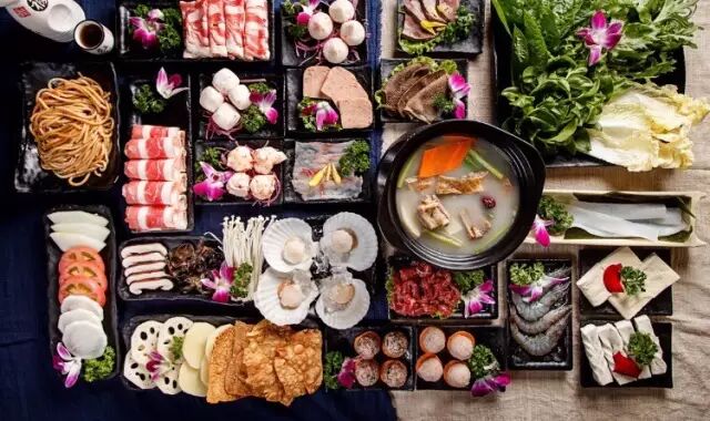 取完小料一道道菜品陆续摆上餐桌。应季时节提供的限量松茸、鲜滑爽嫩的鲜虾丸、q弹爽口的建水香豆腐、降火清肺的穿心莲,更有野生菌丸、束河嫩牛肉、鱼片、大虾、扇贝、肥牛、香菜肉丸、芝士丸、龙虾丸、午餐肉、金针菇、藕片等等等等——当所有涮物铺陈一桌,丰盛如画,而这些只要你还有肚量,都可无限续添。