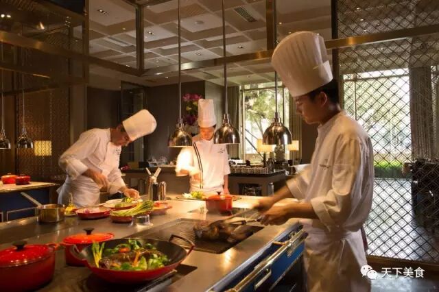 一家好的餐厅,环境必然傲人。踏入荣尊1893餐厅,铜质的镂空屏风与湖蓝色的开放式厨房在柔和的光线下相互映衬。餐厅中最引人注目的是位于中央的开放式厨房,宾客可近距离观赏大厨烹饪技艺的演绎。厨房中的两台纯手工打造的Molteni炉具是所有世界米其林餐厅的梦想之选。