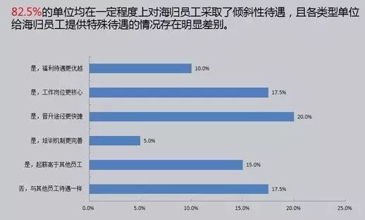 《2016中国海归就业调查报告》显示,82.5%的单位均在一定程度上对海归员工采取了倾斜性待遇。如20%的单位认为海归员工在本单位的晋升更快捷,17.5%的单位海归员工的工作岗位更核心等。