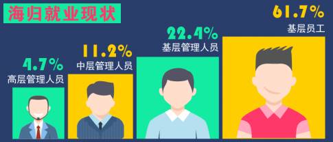 中国与全球化智库与海威时代联合发布的《2016中国海归就业调查报告》显示,对各类留学归国人员的调查中,超过六成目前是基层员工,而成为高层管理人员的被调查者只占总数4.7%,22.4%为基层管理人员,11.2%为中层管理人员。