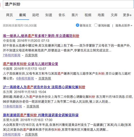 小编在百度中搜索了遗产纠纷,共有13万余篇新闻报道。其中包括“遗产继承有纠纷