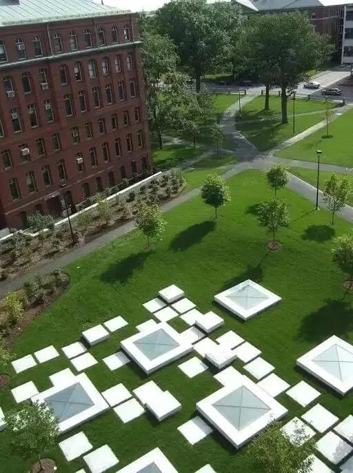 多彩艳丽的采光井不仅为地下停车场内提供了光线和自然通风,同时成为地面景观的亮点。
