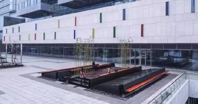 采光井如同一块宝石居中,旁边是休憩的座椅。景观、花池。雕塑感与灌木结合,相得益彰。