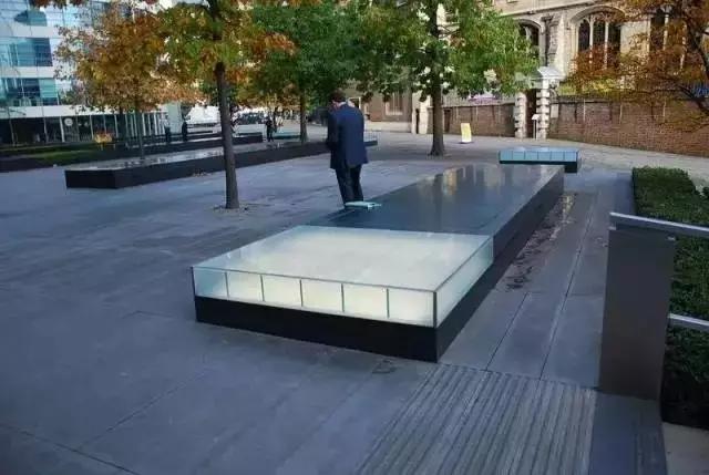 采光井往往由两个部分组成:坚实的井壁往往采用钢筋混凝土结构,透明的井盖往往采用玻璃、亚克力等材料。坚实的井壁可作为坐凳面、花池壁,了解各自组成部位的特征后方可与小品设施进行合理的结合。