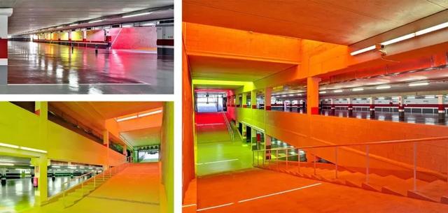 而通过上方的采光井的色彩分布,地下停车场内部也呈现出多彩的空间氛围。