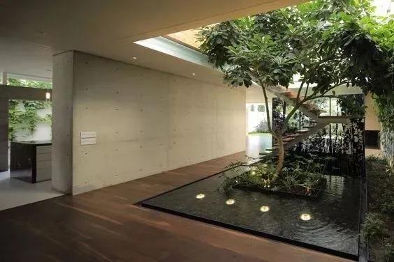 这种将采光井与水景的结合被赋予了多种多样的使用价值。这是一种创新的尝试,也是将景观元素的运用做到了极致。