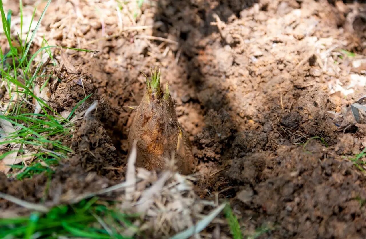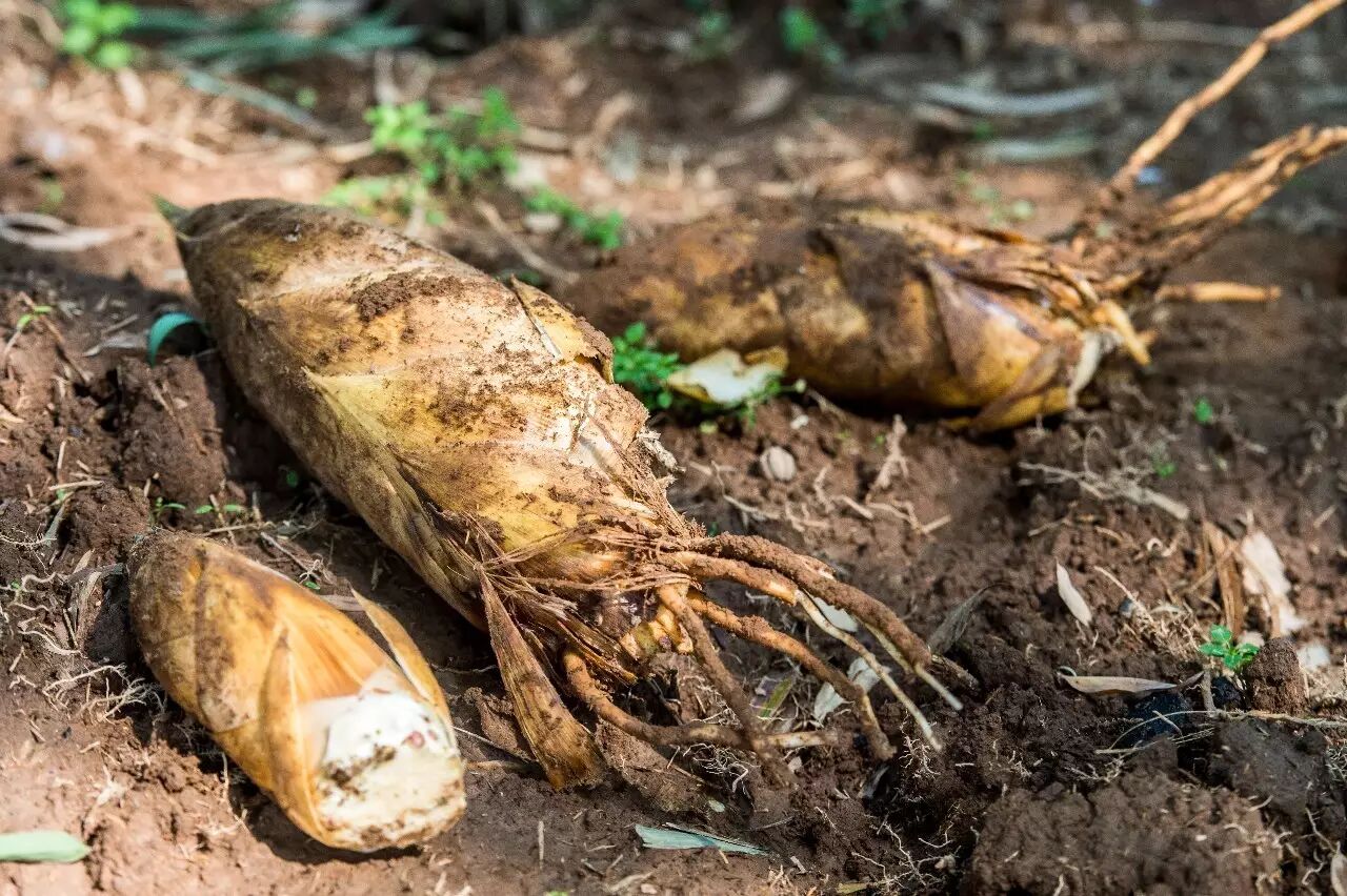 采春笋的农民一早便上山,在地面上逐个搜寻,只要见哺鸡笋稍露出一点头,便马上采挖,赶在接触空气、阳光之前采到最水嫩最脆甜的初生竹笋。