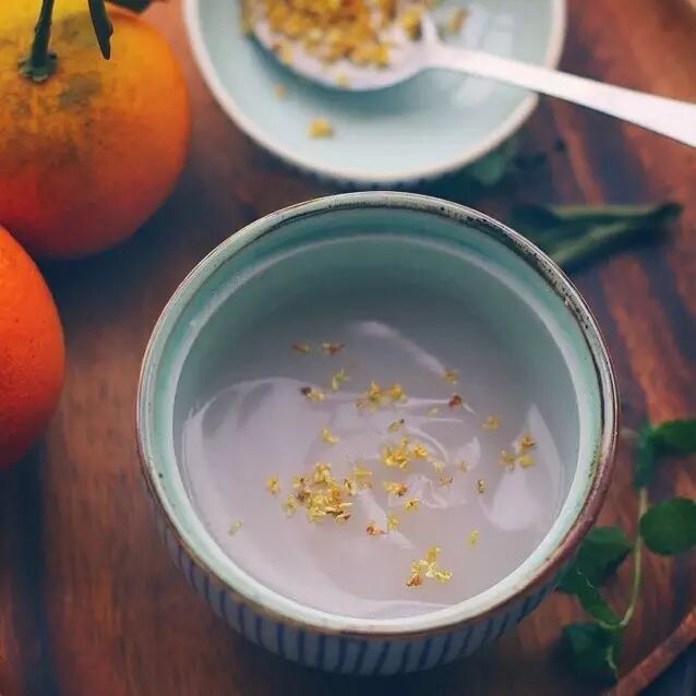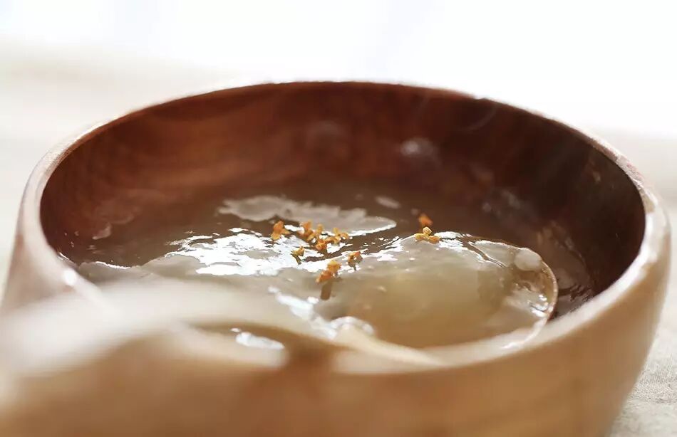 一小勺雪花藕粉,经开水一冲,化为一碗粉嫩晶莹的藕粉羹,撒上一撮桂花,清香又绵滑。桂花藕粉羹无论何时都带着一种恬淡的意蕴,就像西子湖畔的撑着油纸伞的少女,温润如玉。