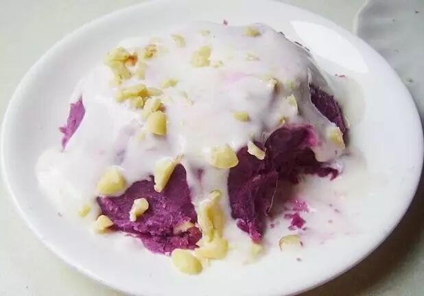 ❷ 紫薯蒸熟后,压成泥,加入蜂蜜搅拌均匀,也可加入些果仁。