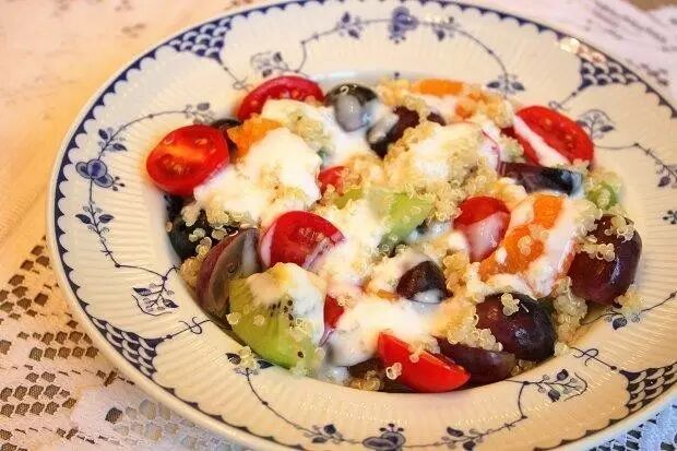 ❷ 把水果装盘,铺上沥干水的藜麦,拌上酸奶即可。