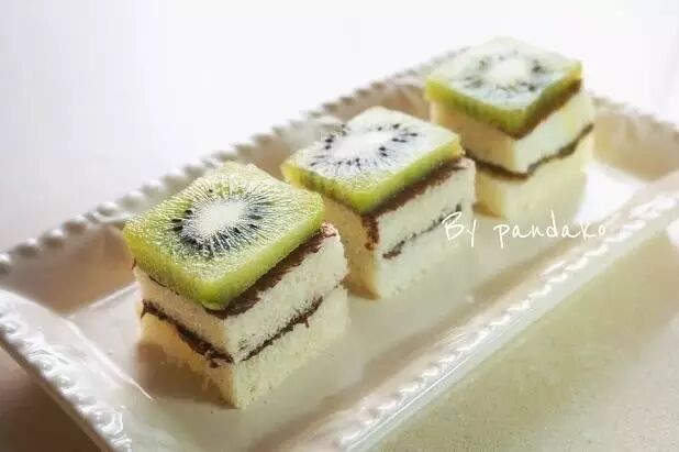 ❸ 奇异果切片,切去四边,变成跟面包片差不多大小的四方块,放在顶层。完成!