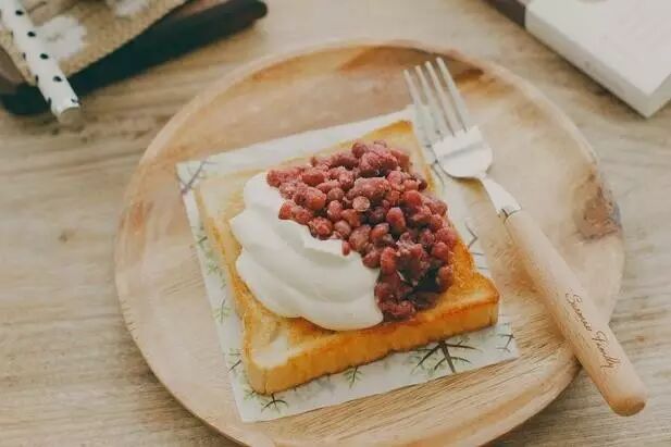 两面烤到金黄色的吐司和鲜奶油超级搭,再堆上糖渍红豆,完美~