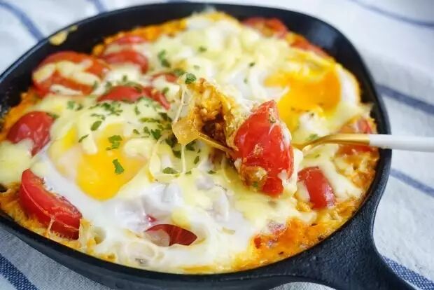 底部铺上番茄,打入鸡蛋,最后撒上芝士,一勺下去扯出长长的丝,升级版的番茄炒蛋让美味也升级。