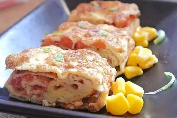 西红柿与鸡蛋的新鲜吃法,小火慢煎,依次卷好成形的蛋液,大大地咬上一口,整个口腔都被鲜嫩的厚蛋烧填满,吃过就忘不了。