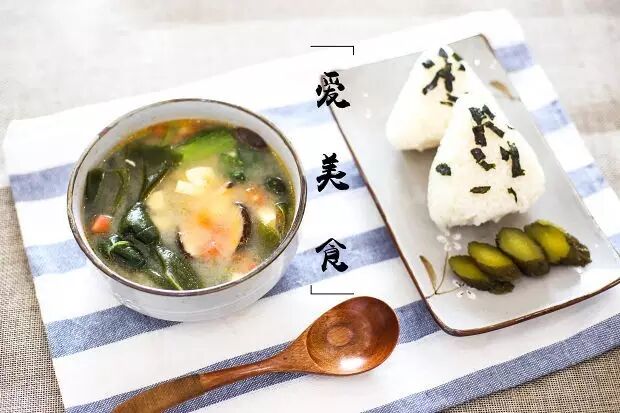 来一份番茄味噌汤饭团子套餐!蒸一锅米饭,趁热拌入寿司醋,捏成小饭团裹上海苔即可!