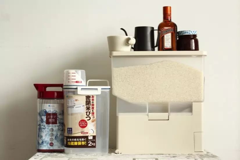 此外,这款米箱的抽屉式取米设计,不必翻开上面的米箱盖。米箱盖上还可以放置一些小物件,让厨房空间得到充分利用。