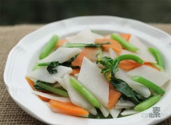 去皮后山药切成菱片,洗去粘液。再将山药、胡萝卜和菜心过热水,下锅快速翻炒几下即可。简单几步,就能做出一道口感清脆的家常菜。一白一黄一绿间。像极了一幅田野秋日图。