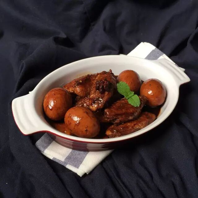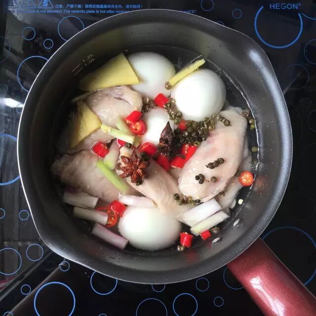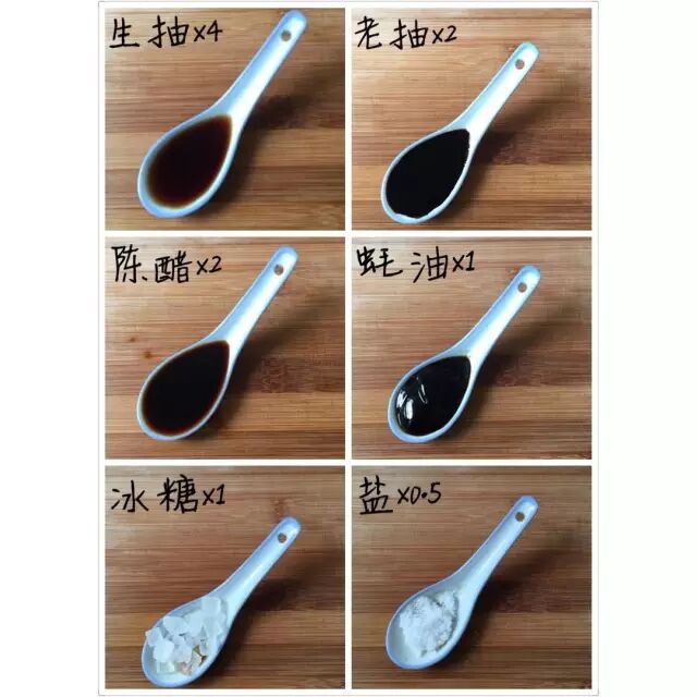 ❹汤勺的调味秘籍看这里!加生抽4汤勺、老抽2汤勺、陈醋2汤勺、蚝油1汤勺、冰糖1汤勺、麻油1茶勺、盐(调整用)半汤勺(可不加),加完所有调料应该刚好覆盖了鸡翅鸡蛋,如果还未覆盖,请添加清水至完全覆盖。(PS:汤勺是图片上的,具体一汤勺容量为多少我没具体量过。)