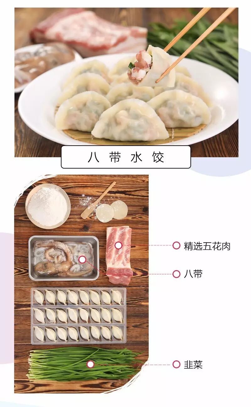 当季的八带新鲜有嚼劲,每嚼上一口仿佛都吃到了大海的味道,也是青岛当地人最爱的软体海味。直接把大块八带肉包入饺子,只搭配精选五花肉,每一口都弹牙有嚼劲,一本满足~