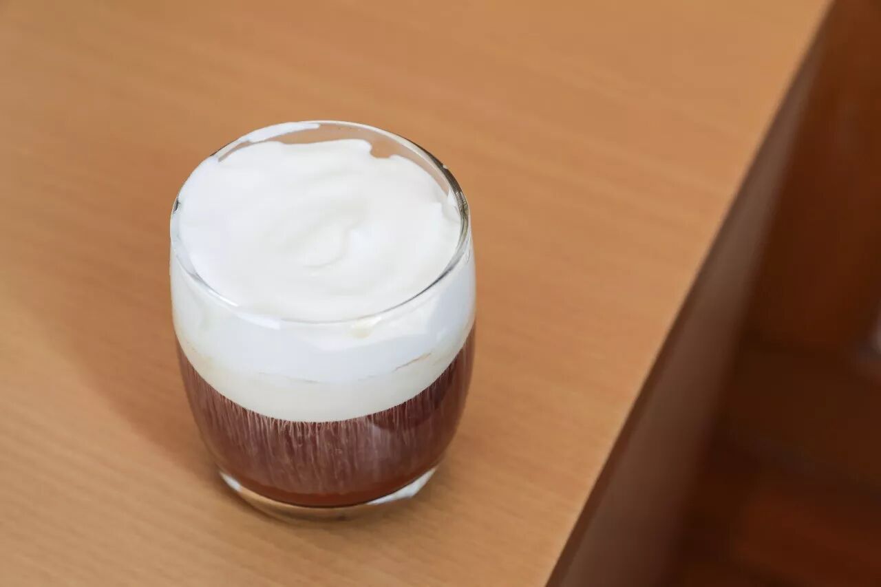 然后制作奶盖。80g 淡奶油、20g 鲜牛奶与 5-10g 糖混合,打发到有纹路。