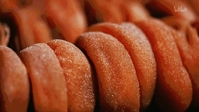 除了新鲜好吃有颜值,《水果传》的旁白文案也生动形象,充满了诗意:“柿子将要暂时告别阳光和空气,进入黑暗,开始一场漫长而甜蜜的梦。”柿子去皮、挂晒,揉捏果肉,使柿子软化、脱涩。一个月后柿子彻底糖化,身体也会变成诱人的金黄色。冬季备受大家喜爱的柿饼就是这么诞生的。