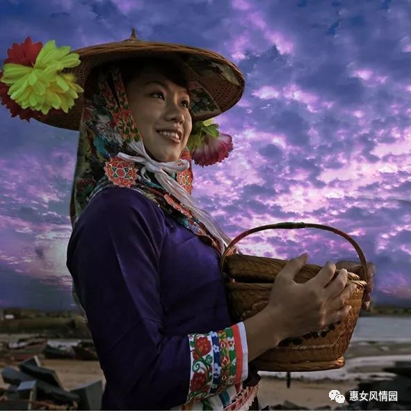 惠安女服饰,这一高彩度、高纯度,这一长短不同、材料不同、花色不同,以示丰富性的组合搭配,是活生生的乡土文化教材,是摄影艺术创作的源泉,是画家表达海滨景象画龙点睛的主体。她们,无论是俯身刺绣,还是晒网织网,还是扛运石块、其妙曼的身姿动态,在摄影师的镜头下,在画家的笔触下,成活,成精,成品。